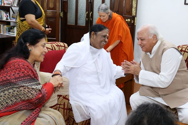 ഇവരെ ഗവർണർ ആരിഫ് മുഹമ്മദ് ഖാനും അദ്ദേഹത്തിന്റെ ഭാര്യ രേഷ്മ ആരിഫ് മുഹമ്മദ് ഖാനും ചേർന്ന് സ്വീകരിച്ചു. ഇരുവർക്കുമൊപ്പം ദീർഘനേരം സംസാരിച്ചിരുന്ന ശേഷമാണ് മാതാ അമൃതാനന്ദമയി മടങ്ങിയത്.