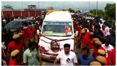 കണ്ണൂര്: എയര് ആംബുലന്സില് കണ്ണൂരിലെത്തിച്ച കോടിയേരി ബാലകൃഷ്ണന്റെ മൃതദേഹം നേതാക്കള് ഏറ്റുവാങ്ങി. തലശ്ശേരിയിലേക്ക് മൃതദേഹവും വഹിച്ചുള്ള വിലാപയാത്ര ആരംഭിച്ചു. തുറന്ന വാഹനത്തില് പ്രവര്ത്തകരുടെ അകമ്പടിയോടെയാണ് വിലാപയാത്ര. പതിനാല് കേന്ദ്രങ്ങളില് ജനങ്ങള്ക്ക് ആദരം അര്പ്പിക്കാന് വിലാപയാത്ര നിര്ത്തും. മട്ടന്നൂര്, നെല്ലൂന്നി, ഉരുവച്ചാല്, നീര്വേലി, കൂത്തുപറമ്പ്, ആറാംമൈല്, വെറ്റുമ്മല്, കതിരൂര്, പൊന്ന്യം, ചുങ്കം എന്നിടവങ്ങളില് ജനങ്ങള്ക്ക് ആദരം അര്പ്പിക്കാം. കോടിയേരിയെ അവസാനമായി കാണാന് വന് ജനപ്രവാഹമാണ് റോഡിന് ഇരുവശവും നിറഞ്ഞിരിക്കുന്നത്.