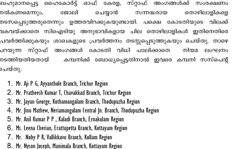 ശാഖകളുടെ പ്രവർത്തനം തടസ്സപ്പെടുത്തുകയും ജോലിക്കെത്തിയവരെ തടയുകയും ചെയ്തതിനാണ് നടപടിയെന്ന് മുത്തൂറ്റ് മാനേജ്മെൻറ് വ്യക്തമാക്കി. ജോലി ചെയ്യാന് സന്നദ്ധരായി എത്തുന്ന ജീവനക്കാര്ക്ക് തടസ്സങ്ങളുണ്ടാക്കരുതെന്നും അവര്ക്ക് സംരക്ഷണം നല്കണമെന്നും ഹൈക്കോടതി ഉത്തരവുണ്ടായിരുന്നതാണ്. ഇത് ലംഘിച്ച് സിഐടിയു അനുഭാവികളായ ചില ജീവനക്കാര് ശാഖകളുടെ പ്രവര്ത്തനം തടസ്സപ്പെടുത്തി. ഇക്കാരണത്താല് എട്ട് ജീവനക്കാരെ സസ്പെന്ഡ് ചെയ്യുകയാണെന്നാണ് മുത്തൂറ്റ് ഫിനാന്സ് വാര്ത്താക്കുറിപ്പില് അറിയിച്ചിരിക്കുന്നത്.