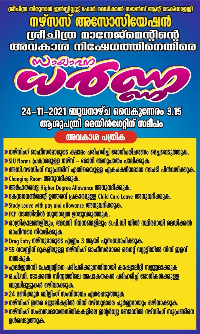 തിരുവനന്തപുരം: ശ്രീചിത്ര മാനേജ്മെന്റിനെതിരെ (Sri Chithra management) നാളെ നഴ്സസ് അസോസിയേഷന്റെ (Nurses association) നേതൃത്വത്തില് ധര്ണ. വൈകീട്ട് മൂന്നേ കാലിന് ആശുപത്രി പ്രധാന ഗേറ്റിലാണ് സമരം. 16ഓളം അവകാശങ്ങള് ഉന്നയിച്ചാണ് സംഘടന സമരം നടത്തുന്നത്. നഴ്സിങ് ഓഫിസര്മാരുടെ ക്ഷാമം പരിഹരിച്ച് രോഗീപരിചരണം മെച്ചപ്പെടുത്തുക, ചട്ടപ്രകാരമുള്ള നഴ്സ്-രോഗി അനുപാതം പാലിക്കുക, അസി. നഴ്സിങ് സൂപ്രണ്ടിനെതിരെയുള്ള ഏകപക്ഷീയ നടപടി പിന്വലിക്കുക, ചേഞ്ചിംഗ് റൂം അനുവദിക്കുക, നിയമപ്രകാരമുള്ള ചൈല്ഡ് കെയര് ലീവ് അനുവദിക്കുക, ശമ്പളത്തോടെയുള്ള സ്റ്റഡീ ലീവ് അനുവദിക്കുക, ഹയര് ഡിഗ്രി അലവന്സ് അനുവദിക്കുക തുടങ്ങിയ ആവശ്യങ്ങളാണ് മുന്നോട്ടുവെച്ചിരിക്കുന്നത്.