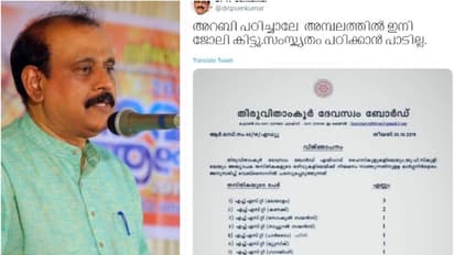 തിരുവനന്തപുരം: തിരുവിതാം കൂര് ദേവസ്വം ബോര്ഡിന് കീഴിലുള്ള എയ്ഡഡ് ഹൈസ്കൂളുകളിലേക്കും യുപി സ്കൂളുകളിലേക്കും അധ്യാപകരെ വിളിച്ചുകൊണ്ട് ദേവസ്വം ബോര്ഡ് പുറത്തിറക്കിയ വിഞ്ജാപനം തെറ്റിദ്ധരിപ്പിക്കുന്ന തലക്കെട്ടോടെ ഷെയര് ചെയ്ത മുന് ഡിജിപിയും ബിജെപി നേതാവുമായ ടിപി സെന്കുമാറിനെതിരെ രൂക്ഷ വിമര്ശനവുമായി സോഷ്യല് മീഡിയ. ടിപി സെന്കുമാര് തന്റെ ഫേസ്ബുക്ക് പേജിലും ട്വിറ്ററിലും 'അറബി പഠിച്ചാലേ അമ്പലത്തിൽ ഇനി ജോലി കിട്ടൂ, സംസ്കൃതം പഠിക്കാൻ പാടില്ല' എന്ന തലക്കെട്ടോടെ പോസ്റ്റ് ചെയ്ത കുറിപ്പ് വലിയ വിമര്ശനത്തിനിടയാക്കിയിരിക്കുകയാണ്.
