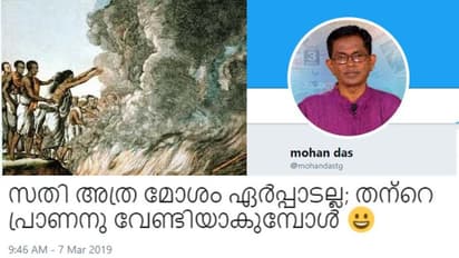 തിരുവനന്തപുരം: ആർഎസ്എസ് സൈദ്ധാന്തികൻ ടി ജി മോഹൻ ദാസ് കഴിഞ്ഞ ദിവസം ട്വീറ്റ് ചെയ്തത് ഇങ്ങനെ. 'സതി അത്ര മോശം ഏർപ്പാടല്ല; തന്റെ പ്രാണനു വേണ്ടിയാകുമ്പോൾ' പ്രധാനമന്ത്രി നരേന്ദ്രമോദിയുടേയും അദ്ദേഹത്തിന്റെ ഭാര്യ യശോദ ബെന്നിന്റേയും ദാമ്പത്യത്തെ ആധാരമാക്കി ടി ജി മോഹൻദാസ് ട്വിറ്ററിൽ എഴുതിയ കുറിപ്പിന് പിന്നാലെയാണ് സതിയെ ന്യായീകരിച്ചുകൊണ്ടുള്ള എഴുത്ത്.