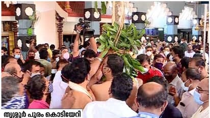 തൃശ്ശൂര്: തിരുവമ്പാടി -പാറമേക്കാവ് ക്ഷേത്രങ്ങളില് പൂരത്തിന്റെ കൊടിയേറി. പൂജ ചെയ്ത കൊടിക്കൂറ തന്ത്രിമാര് ക്ഷേത്രത്തിന് പുറത്തേക്ക് കൊണ്ടുവന്നു. തിരുവമ്പാടി ക്ഷേത്രത്തില് പാരമ്പര്യ അവകാശികളായ താഴത്തുപുരയ്ക്കല് കുടുംബങ്ങള് ഭൂമിപൂജ നടത്തി ദേശക്കാരെല്ലാം കൊടിയേറ്റുകയായിരുന്നു.