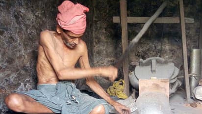 ഇടുക്കി: മനോരോഗിയായ മകനേയും ഭാര്യയേയും സംരക്ഷിക്കാന് ആലയില് ഇരമ്പ് ദണ്ഡുകളോട് മല്ലടിക്കുകയാണ് രാഘവ പണിക്കര്. കുലത്തൊഴിലാണ് ആയുധം പണിയെങ്കിലും പട്ടിണി മാറ്റാന് എഴുപത്തിനാലുകാരന് കഷ്ടപ്പെടണം. ഇടുക്കി ചേലച്ചുവട് വടക്കേടത്ത് രാഘവ പണിക്കരെന്ന വയോധികനാണ് മാനസികരോഗിയായ മകനേയും രോഗിയായ ഭാര്യയേയും സംരക്ഷിക്കാനായി വാര്ദ്ധക്യത്തിലും ആലയില് ഇരുമ്പ് ദണ്ഡുകളെ തന്നാലാവും വിധം പ്രഹരിക്കുന്നത്.