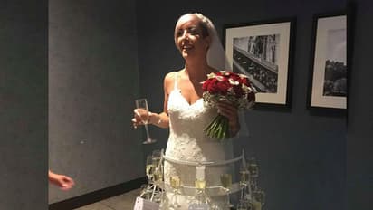 50 ഗ്ലാസുകളില് മദ്യം ഉള്കൊള്ളുന്ന രീതിയിലുള്ള ഡിസൈനുകളിലെ പുത്തന് ഫാഷന് വിവാഹവസ്ത്രമാണ് കെറി മക്മില്ലണ് അണിഞ്ഞത്. സ്റ്റീലുകൊണ്ട് നിര്മ്മിച്ച നാല് നിരയില് 50 ഗ്ലാസുകള് വയ്ക്കാവുന്ന തരത്തിലാണ് വിവാഹ വസ്ത്രം കെറി ഡിസൈന് ചെയ്തിരിക്കുന്നത്. മെറ്റല് ഫ്രെയിം ഉണ്ടാക്കി അതിനകത്ത് വിവാഹ വസ്ത്രവുമായി കയറി നില്ക്കാവുന്ന തരത്തിലാണ് ഇത് നിര്മ്മിച്ചിരിക്കുന്നത്.