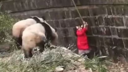 ചുറ്റും ആളുകള് നോക്കിനില്ക്കെ, പാണ്ടകള് ഓരോന്നായി അവള്ക്കരികിലേക്ക് നീങ്ങി. എന്നാല് അവര് അവളെ ഉപദ്രവിക്കാന് ശ്രമിച്ചില്ല. പേടിച്ച് കരഞ്ഞുകൊണ്ടിരിക്കുന്ന കുഞ്ഞിനെ രക്ഷപ്പെടുത്താന് കാഴ്ചബംഗ്ലാവിലെ സുരക്ഷാ ജീവനക്കാര് ശ്രമവും തുടങ്ങി.