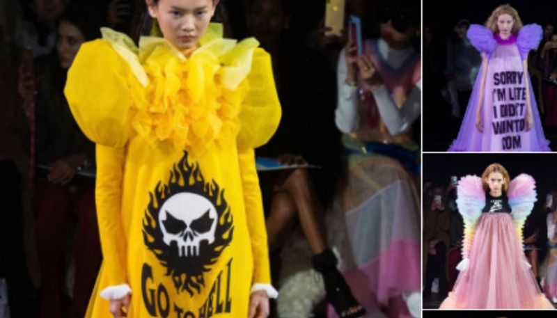 എഴുത്തുകള് ഉള്പ്പെടുത്തിയ വസ്ത്രങ്ങള് മുമ്പേ തരംഗം സൃഷ്ടിച്ച് കടന്നുപോയതാണ്. എങ്കിലും മീമുകളെ ഓര്മ്മിപ്പിക്കുന്ന തരത്തിലുള്ള രസകരമായ പ്രസ്താവനകള് രേഖപ്പെടുത്തിയ ഗൗണുകള് വീണ്ടും ഫാഷന് പ്രേമികള്ക്കിടയില് പുതുമയുണര്ത്തി.