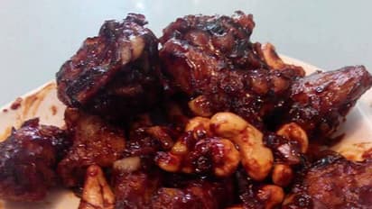 എണ്ണ ചൂടാക്കുമ്പോള് അതിലേക്ക് പൊടിപൊടിയായി അരിഞ്ഞ വെളുത്തുളളി ഇടുക. നിറം മാറി തുടങ്ങുമ്പോള് സോയാ സോസ് ഒഴിക്കുക. ചൂടായി വരുമ്പോള് വിനാഗിരി ഒഴിക്കുക. ഒന്ന് തിളക്കുമ്പോള് ടൊമാറ്റോസോസും ഒഴിക്കുക. എല്ലാം മിക്സ് ചെയ്ത് അതിലേക്ക് ഫ്രൈ ചെയ്ത ചിക്കന് കഷങ്ങള് യോജിപ്പിക്കുക. സ്രീറ്റ് & ക്രിസ്പി ചിക്കന് റെഡി. സെര്വിങ് ഡിഷിലേക്ക് മാറ്റുമ്പോള് ഫ്രൈ ചെയ്ത കാഷ്യു ചേര്ക്കാം.