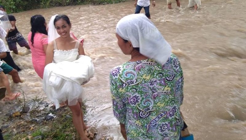 പ്രളയത്തില് കര കവിഞ്ഞൊഴുകുന്ന പുഴ മുറിച്ചുകടന്ന് വിവാഹച്ചടങ്ങിനായി പള്ളിയിലേക്ക് പോകുന്ന വധുവും വരനുമാണ് ചിത്രങ്ങളിലുള്ളത്. വിവാഹം നിശ്ചയിച്ചിട്ട് മാസങ്ങളായിരുന്നു. ഇതിനിടെ തികച്ചും അപ്രതീക്ഷിതമായാണ് പ്രളയത്തിന്റെ വരവ്. വിവാഹം മാറ്റിവയ്ക്കാനുമാകില്ലെന്ന അവസ്ഥയായി.