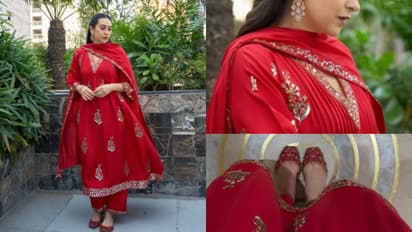 കടും ചുവപ്പ് നിറത്തിലുള്ള ഈ കുർത്തയിൽ വെള്ളി നൂലുകൾ കൊണ്ട് തുന്നിയ 'തില്ല' എംബ്രോയ്ഡറി വർക്കുകൾ വസ്ത്രത്തിന് ഒരു രാജകീയ പ്രൗഢി നൽകുന്നു. ലളിതമായ നെക്ക് ഡിസൈനും കൈകളിലെ ചെറിയ എംബ്രോയ്ഡറിയും താരത്തിന്റെ ഭംഗി വർദ്ധിപ്പിക്കുന്നു. മാച്ചിംഗ് ആയ സ്ട്രെയിറ്റ് പാന്റും സുതാര്യമായ ഷീർ ദുപ്പട്ടയുമാണ് ഇതിനൊപ്പം താരം ധരിച്ചത്. വസ്ത്രത്തിന് അനുയോജ്യമായ രീതിയിൽ 'ഫിസി ഗോബ്ലറ്റ്' ബ്രാൻഡിന്റെ മനോഹരമായ ജുട്ടികളും കരിഷ്മ അണിഞ്ഞിരുന്നു.