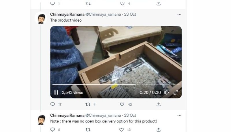 ചിന്മയ രമണ എന്ന് പേരുള്ള യുവാവ് ട്വിറ്ററിലൂടെയാണ് തന്റെ അനുഭവം പങ്കുവച്ചിരിക്കുന്നത്. ഓര്ഡറെത്തി അത് അണ്ബോക്സ് ചെയ്യുന്ന വീഡിയോയും ഇദ്ദേഹം പങ്കുവച്ചിട്ടുണ്ട്. പെട്ടി തുറന്നുകഴിയുമ്പോള് അതിനകത്ത് ലാപ്ടോപിന് പകരം വലിയൊരു കല്ലും ഉപേക്ഷിക്കപ്പെട്ട ഇലക്ട്രോണിക് സാധനങ്ങളുടെ അവശിഷ്ടങ്ങളും കിടക്കുന്നത് കാണാം.