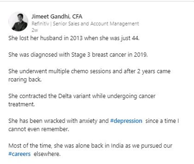 അമ്മ വിഷാദരോഗത്തെയും ക്യാൻസറിനെയും മറികടന്നു. 2013-ൽ നാൽപത്തിമൂന്നാമത്തെ വയസ്സിലാണ് അമ്മയ്ക്ക് അച്ഛനെ നഷ്ടമായത്. 2014-ലാണ് അമ്മയ്ക്ക് കാൻസർ ബാധിച്ചത്. മൂന്നാമത്തെ ഘട്ടമായിരുന്നു അത്. രണ്ടു വർത്തോളം നിരവധി കീമോതെറാപ്പികൾ ചെയ്തു. അവസാനം കൊവിഡിന്റെ ഡെൽറ്റാ വകേഭദവും അമ്മയെ പിടികൂടി. എന്നാൽ എല്ലാത്തിനെയും അമ്മ അതിജീവിച്ചു. ഒടുവിൽ അമ്മ ആ തീരുമാനം എടുക്കുകയും ചെയ്തു. അമ്മ അമ്പത്തി രണ്ടാം വയസ്സിൽ വീണ്ടും പ്രണയം കണ്ടെത്തി. താൻ സ്നേഹിക്കുന്നയാളെ അമ്മ വിവാഹം കഴിച്ചു...- ജിമീത് കുറിച്ചു.