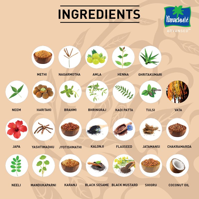 നെല്ലിക്ക, മൈലാഞ്ചി, ഉലുവ, നാഗർമോത, കുമാരി, ബ്രഹ്മി, കയ്യോന്നി, ആര്യവേപ്പ്, യാഷ്ടിമധു, ജ്യോതിഷ്മതി, ജാപ, കുടഞ്ഞാൽ (കുടകം), കറിവേപ്പില, കരിഞ്ചീരകം, തുളസി, ചെറുചെന വിത്ത് (ഫ്ലാക്സ് സീഡ്), ജതമാംസി, കടുക്ക, തകര, നീലി, ഉങ്ങ് (കരഞ്ഞ), കറുത്ത എള്ള്, കടുക്, മുരിങ്ങ, വെളിച്ചെണ്ണ തുടങ്ങിയവയാണ് ഹെയർ ഓയിലിലെ ചേരുവകൾ. ഓരോ ചേരുവകളും നീളമുള്ളതും ആരോഗ്യമുള്ളതുമായ തലമുടി ലഭിക്കാന് സഹായകമാകുന്നു. ആയുർവേദ വിധിപ്രകാരം ഓരോ ചേരുവകളും നിശ്ചിത അളവിൽ ചേർക്കുന്നതുവഴി ഫലസിദ്ധി വർധിച്ച എണ്ണ ലഭ്യമാകുന്നു.