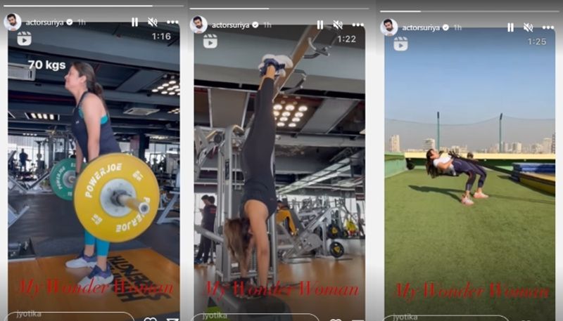 ഇപ്പോഴിതാ ഭാര്യയുടെ വര്ക്കൗട്ട് വീഡിയോ അഭിമാനപൂര്വം പങ്കുവച്ചുകൊണ്ട് സൂര്യ, ജ്യോതിക പറയാറുള്ളതെല്ലാം അക്ഷരാര്ത്ഥത്തില് ശരിയാണെന്ന് തെളിയിക്കുകയാണ്. ജ്യോതികയുടെ വര്ക്കൗട്ട് വീഡിയോ 'മൈ വണ്ടര് വുമണ്' എന്ന അടിക്കുറിപ്പോടെയാണ് സൂര്യ ഇൻസ്റ്റ സ്റ്റോറിയായി പങ്കുവച്ചിരിക്കുന്നത്.