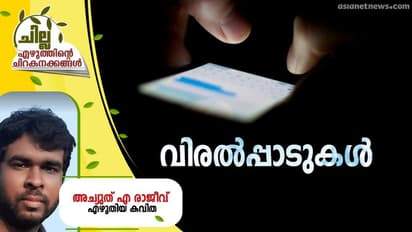 ചില്ല. മികച്ച എഴുത്തുകള്ക്ക് ഒരിടം. സൃഷ്ടികള് submissions@asianetnews.in എന്ന വിലാസത്തില് അയക്കൂ. ഒപ്പം ഫോട്ടോയും വിശദമായ വിലാസവും അയക്കണം. എഡിറ്റോറിയല് ബോര്ഡ് തെരഞ്ഞെടുക്കുന്ന സൃഷ്ടികള് പ്രസിദ്ധീകരിക്കും