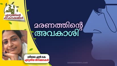 ചില്ല. മികച്ച എഴുത്തുകള്ക്ക് ഒരിടം. സൃഷ്ടികള് submissions@asianetnews.in എന്ന വിലാസത്തില് അയക്കൂ. ഒപ്പം ഫോട്ടോയും വിശദമായ വിലാസവും അയക്കണം. എഡിറ്റോറിയല് ബോര്ഡ് തെരഞ്ഞെടുക്കുന്ന സൃഷ്ടികള് പ്രസിദ്ധീകരിക്കും