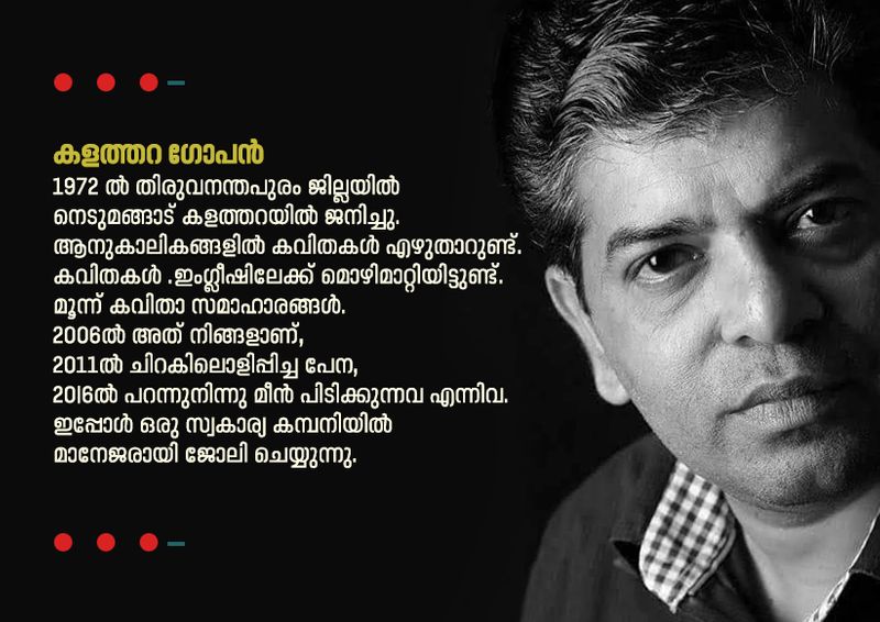 പരിണാമചക്രങ്ങളാല് അടര്ന്നുപോവാത്ത പ്രകൃതിയുടെ പ്രാക്തനമായ ഒരിഴ വീണുകിടക്കുന്നുണ്ട് കളത്തറ ഗോപന്റെ കവിതകളില്. പുതിയ കാലത്തിന്റെ കവിതയാവുമ്പോഴും അത് മരിച്ചടര്ന്നുപോയ കാലങ്ങളുമായി ചാര്ച്ച പുലര്ത്തുന്നു. ഇപ്പോഴില്ലാത്ത നക്ഷത്രദീപ്തിയില് സ്വയം കാണുന്നു. പ്രാചീനമായൊരു നിലാവുണ്ട് ആ കവിതകളുടെ ആകാശത്ത്. അതിനു താഴെ ആദിമ ജീവിതം. പക്ഷികളും മൃഗങ്ങളും ഷഡ്പദങ്ങളും കടലും പുഴയും കാറ്റും ആകാശവും മണ്ണുമെല്ലാം അതാതിന്റെ ഇടങ്ങളില്. മൃഗശാലയില് മാത്രം മൃഗങ്ങളെ കാണാന് യോഗമുള്ളൊരു കാലത്തില്നിന്ന് ഗോപന്റെ കവിത ഇടയ്ക്കിടെ ചെന്നുപോരുന്ന ഇടമാണത്. അതിനാലാണ് ഗോപന്റെ കവിതയിലെ കുരങ്ങിന് 'രോമക്കുപ്പായം അഴിച്ചുവെച്ചിട്ടും മരങ്ങള് കാണുമ്പോള് എന്തോ ഒരിത് ' തോന്നുന്നത്. ചുംബനതീവ്രതയിലും ഇണയിലൊരു ചെടിയെ കാണാനാവുന്നത്. 'ഏത് ബോധിവൃക്ഷച്ചുവട്ടിലും ഒരു ബുദ്ധനിപ്പോഴു'മിരിപ്പുണ്ടെന്ന് തിരിച്ചറിയാനാവുന്നത്.