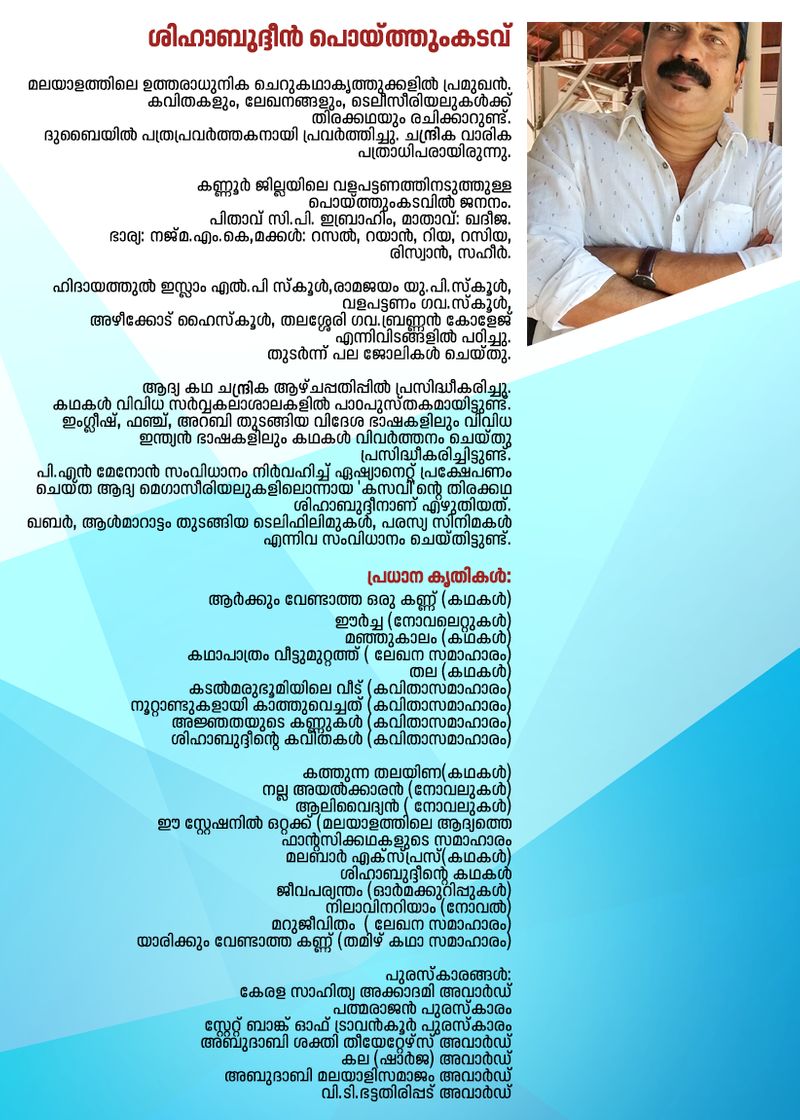 കൈയാളും താങ്ങുമില്ലാതെ മലയാള സാഹിത്യത്തിന്റെ അതിവേഗ പാതയില് ചെന്നുപെട്ടൊരു കുട്ടിയുടെ അമ്പരപ്പുണ്ട് ഇപ്പോഴും ശിഹാബുദ്ദീന് പൊയ്ത്തുംകടവിന്റെ കഥകളില്. എത്ര പറഞ്ഞാലും തീരാത്ത കഥകളുടെ തിക്കുമുട്ടലുകളാണ് ആ കുട്ടിയെ എഴുത്തിന്റെ അപരിചിതവഴിയിലേക്ക് സ്വയം ഇറക്കിവിട്ടത്. വഴി കാട്ടാനും വിളക്കു കൊളുത്താനും ആരുമില്ലായിരുന്നു. അതിനാല്, വഴിയും വെട്ടവും സ്വയം സൃഷ്ടിക്കേണ്ടി വന്നു. കഥകള് മാത്രമായിരുന്നു എന്നും തുണ. ഉമ്മയില്നിന്നാണ് കഥ പറച്ചിലിന്റെ മാന്ത്രിക വടി കിട്ടിയതെന്ന് ഒരഭിമുഖത്തില് ശിഹാബുദ്ദീന് പറയുന്നുണ്ട്. കഥകളുടെ കുട്ടിക്കാലത്തില്നിന്നും നിവര്ന്നുണര്ന്നപ്പോള് ശിഹാബുദ്ദീന് കണ്ടത് കഥയേക്കാള് വിചിത്രമായ ജീവിതങ്ങളായിരുന്നു. ആ ജീവിതങ്ങളും അനുഭവങ്ങളുമാണ് മൂന്നര പതിറ്റാണ്ടായി ശിഹാബ് എഴുതുന്നതിലേറെയും.