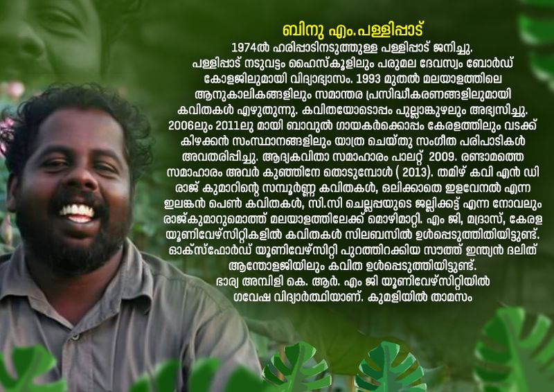 അടിത്തട്ട് ജീവിതങ്ങളുടെ പല കരകളാണ് ബിനു എം പള്ളിപ്പാടിന്റെ കവിതകള്. കവിതയുടെ വരേണ്യ ഇടങ്ങള്ക്ക് പുറത്ത് കാലങ്ങളോളം നിശ്ശബ്ദമായി നിന്ന മനുഷ്യരും ജീവിതങ്ങളും അനുഭവങ്ങളും അവിടെ തല ഉയര്ത്തി വന്നുനില്ക്കുന്നു. പ്രകൃതിയും ദേശവും കീഴാളശരീരങ്ങളും മലയാളകവിതയില് അധികമൊന്നും കണ്ടുപരിചയിക്കാത്ത നൈസര്ഗികതയോടെ, ജൈവികതയോടെ ആ കവിതകളില് നിറയുന്നു. ദേശം, അവിടെ 'കീഴാളവും ജൈവികവുമായ ആവാസവ്യവസ്ഥയെക്കൂടി രേഖപ്പെടുത്തുന്നു'. പ്രകൃതി അവിടെ, ജീവിതത്തിനു പുറത്തുനില്ക്കുന്ന അപരിചിത ഇടമല്ല. നിരൂപകയായ കലാചന്ദ്രന് ബിനുവിന്റെ കവിതകളെ ഇങ്ങനെ നിരീക്ഷിക്കുന്നു: 'കറുത്ത മനുഷ്യര് ഉഴുതും കൊയ്തും മെതിച്ചും അളന്നും ജീവിച്ചു മണ്ണടിഞ്ഞ പശച്ചേറിലും വെള്ളത്തിലും ബിനുവിന്റെ ദേശം രൂപം കൊള്ളുന്നു. വിയര്പ്പിലും കണ്ണീരിലും ചോരയിലും നിന്ന് വാറ്റിയെടുത്ത ആനന്ദത്തിന്റെ തുള്ളികള് ദേശത്തിന്റെ തന്നെ ജലരൂപകമായി. തൊട്ടും രുചിച്ചും അനുഭവിച്ചറിയുന്ന ഈ ദേശസ്വരൂപം ഹിംസാത്മകവും ഏകശിലാത്മകവുമായ ദേശീയതയ്ക്ക് കീഴിലമരുന്നതിന്റെ ശ്വാസംമുട്ടലും പൊറുതികേടുകളും കൂടി എഴുതുന്നതിലൂടെയാണ് ബിനുവിന്റെ കവിത അതിജീവിക്കുന്നത്. '
