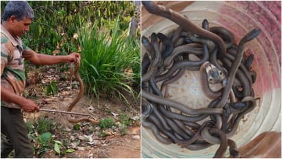 മാനന്തവാടി: ഒന്നും രണ്ടും പതിനാറുമല്ല. 25 മൂര്ഖന് കുഞ്ഞുങ്ങൾ ഒന്നിച്ച് ജനവാസ കേന്ദ്രത്തിൽ. പയ്യമ്പള്ളി പടമല മണിയില ബിജീഷിന്റെ വീടിനു സമീപത്ത് നിന്നാണ് കഴിഞ്ഞ ദിവസം പാമ്പിനെയും പാമ്പിന് കുഞ്ഞുങ്ങളെയും പിടികൂടിയത്. കുഞ്ഞുങ്ങളുള്പ്പെടെ 26 പാമ്പുകളാണ് ഉണ്ടായിരുന്നത്. വീട്ടുപറമ്പിലെ തേക്കുമരത്തിനോട് ചേര്ന്നുള്ള പൊത്തിലായിരുന്നു പാമ്പുകള്. റോഡിലൂടെ സഞ്ചരിക്കുന്നവര് പൊത്തില് നിന്ന് തല വെളിയിലിട്ടിരിക്കുന്ന മൂര്ഖനെ കണ്ടതോടെ വനപാലകരെ വിവരമറിയിക്കുകയായിരുന്നു. ഉടനെ നോര്ത്ത് വയനാട് വനം ഡിവിഷന്റെ അംഗീകൃത പാമ്പുപിടിത്തക്കാരനായ വി പി സുജിത്ത് സ്ഥലത്തെത്തി മാളം പൊളിച്ചു നോക്കിയെങ്കിലും ആദ്യം പാമ്പുകളെ കണ്ടെത്താനായില്ല. തുടര്ന്ന് മാളത്തിനുള്ളിലേക്ക് വെള്ളം ഒഴിച്ചപ്പോഴാണ് വലിയ മൂര്ഖനും കുഞ്ഞുങ്ങളും ഒന്നിന് പിറകേ ഒന്നൊന്നായി പാമ്പിന് കുഞ്ഞുങ്ങള് പുറത്തേക്ക് എത്തിയത്.