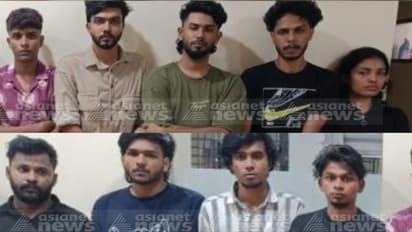 പാലക്കാട് സ്വദേശി ജമീല മൻസിലിൽ സാദിഖ് ഷാ (22 ), പാലക്കാട് സ്വദേശി ബിഷാരത്ത് വീട്ടിൽ സുഹൈൽ ടി.എൻ (22 ), പാലക്കാട് സ്വദേശി കളംപുറം വീട്ടിൽ രാഹുൽ.കെ.എം (24 ), പാലക്കാട് സ്വദേശി ആകാശ്.കെ (22 ),തൃശൂർ സ്വദേശി നടുവിൽപുരക്കൽ വീട്ടിൽ അതുൽകൃഷ്ണ (23),തൃശൂർ സ്വദേശി മുഹമ്മദ് റംഷീഖ് പി ആർ, തൃശൂർ സ്വദേശി നിഖിൽ എം.എസ്, തൃശൂർ സ്വദേശി നിധിൻ യു.എം, തൃശൂർ സ്വദേശിനി രാഗിണി എന്നിവരാണ് പിടിയിലായത്.