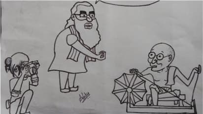 മറ്റൊരു കാർട്ടൂണിൽ ചർക്കയ്ക്ക് അടുത്തിരിക്കുന്ന ഗാന്ധിജിയോട് നരേന്ദ്ര മോദി ചോദിക്കുന്നു, 'ഒന്നു മാറാമോ? ഒരു ഫോട്ടോ എടുക്കാനാണ്..'
