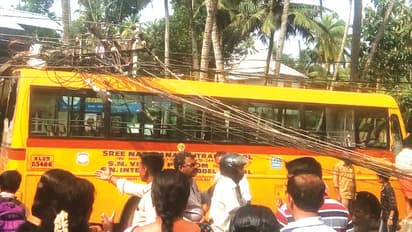 സ്കൂളില് നിന്നും കുട്ടികളെ കയറ്റിയ ബസ് സമീപമുള്ള വളവില് വച്ച് പിന്നോട്ടെടുക്കവേ പോസ്റ്റില് ഇടിച്ചു. ഇടിയുടെ ആഘാതത്തില് തൂണ് ഒടിഞ്ഞ് ബസിനു മുകളിലേക്ക് വീണു. ഭയന്നുവിറച്ച കുട്ടികളെ നാട്ടുകാരും സ്കൂള് അധികൃതരും ചേര്ന്ന് പുറത്തിറക്കുകയായിരുന്നു. ബസിന് മുകളില് നിന്നും പോസ്റ്റും ലൈനുകളും ഉദ്യോഗസ്ഥരെത്തി അഴിച്ചുമാറ്റി. വളവില് റോഡിലേക്കിറങ്ങി അപകടകരമായ രീതിയിലാണ് പോസ്റ്റ് നിന്നിരുന്നതെന്ന് നാട്ടുകാര് പറഞ്ഞു. ഈ പോസ്റ്റ് മാറ്റി സ്ഥാപിക്കണമെന്ന് നാട്ടുകാര് ഏറെ നാളായി ആവശ്യപ്പെട്ടിരുന്നു.