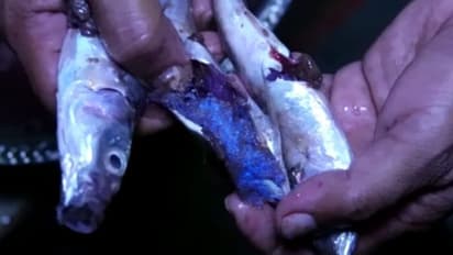 മലപ്പുറം: പാകം ചെയ്യാന് മുറിക്കുന്നതിനിടെ മത്സ്യത്തിന്റെ വയറ്റില് വെട്ടിത്തിളങ്ങുന്ന നീല നിറത്തിലുള്ള വസ്തുക്കള്. മലപ്പുറം ജില്ലയുടെ വിവിധ ഭാഗങ്ങളില് കഴിഞ്ഞ ദിവസം വില്പ്പന നടത്തിയ 'ഐല ചെമ്പാന്' മത്സ്യത്തിനുള്ളിലാണ് നീല നിറം കാണപ്പെട്ടത്. ഇരുട്ട് സമയത്ത് മാത്രം ദൃശ്യമാകുന്ന നീല നിറം പകല് സമയത്തോ, വെളിച്ചം തെളിയിച്ചാലോ കാണാന് സാധിക്കില്ല.