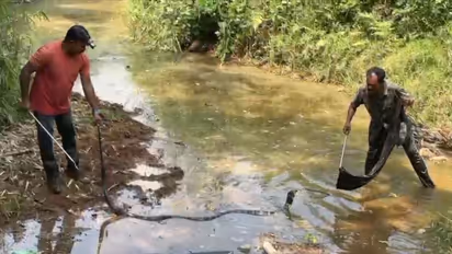 കൊച്ചി: എറണാകുളം കോതമംഗലം പിണ്ടിമനയിൽ നിന്ന് കൂറ്റൻ രാജവെമ്പാലയെ പിടികൂടി. പടിപ്പാറ ഭാഗത്ത് സ്വകാര്യ വ്യക്തിയുടെ റബ്ബർ തോട്ടത്തിൽ ഉച്ചയോടെയാണ് രാജവെമ്പാലയെ ആദ്യം കണ്ടത്. ഏറെ നേരത്തെ പരിശ്രമത്തിനൊടുവിൽ അതിസാഹസികമായി പാമ്പിനെ കൂട്ടിലാക്കുകയായിരുന്നു.