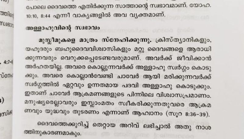 അള്ളാഹുവിന്റെ സ്വഭാവം മുസ്ലിമുകളെ മാത്രം സ്നേഹിക്കുന്നതാണെന്നും ക്രിസ്ത്യാനികളും യഹൂദരും ബഹുദൈവ വിശ്വാസികളും മറ്റ് ദൈവങ്ങളെ ആരാധിക്കുന്നവര് വെറുക്കപ്പെടേണ്ടതാണെന്നും .അവരെ കൊല്ലുന്നവര്ക്ക് അള്ളാഹു സ്വര്ഗം നല്കുമെന്നും അവരെ കൊല്ലാനായി ചാവേറുകളാവുന്നവര്ക്ക് സ്വര്ഗത്തില് ഉന്നത പദവി നല്കുമെന്നും കൈപ്പുസ്തകം പ്രചരിപ്പിക്കുന്നു.