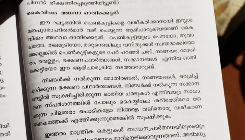 ലൗ ജിഹാദിന്റെ ഒരു ഘട്ടത്തില് പെണ്കുട്ടികളെ വശീകരിക്കാനായി ഇസ്ലാം മതപുരോഹിതന്മാര് വഴി കൈവിഷം നല്കുന്നുവെന്നും പുസ്തകം പറയുന്നു. ഇസ്ലാം അവതരിപ്പിക്കുന്ന അള്ളാഹു എന്ന് ദൈവത്തിന് അവര് കല്പിക്കുന്ന സ്വഭാവം ഈശോ മുന്നറിയിപ്പ് തരുന്നതുപോലെ സാത്താന്റെ സ്വഭാവമാണെന്നും കൈപ്പുസ്തകം അവകാശപ്പെടുന്നു.