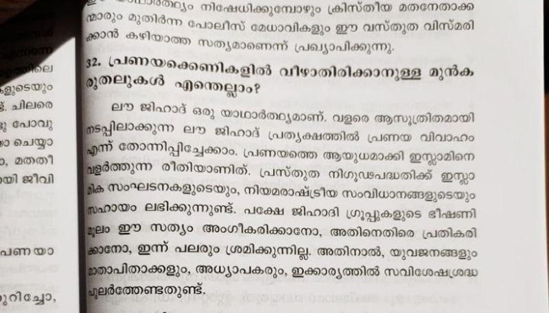 ലൗ ജിഹാദ് സംബന്ധിച്ച് വളരെ വിശാലമായി തന്നെ കൈപ്പുസ്തകം പ്ലസ് വണ്, പ്ലസ് ടു വിദ്യാര്ത്ഥികളോട് ആശയവിനിമയം ചെയ്യുന്നത്. ലൗ ജിഹാദ് എന്ന പ്രണയക്കെണി ഒന്പത് ഘട്ടങ്ങളിലായാണ് നടക്കുന്നതെന്നും കെണികളില് വീഴാതിരിക്കാനുള്ള മുന്കരുതലുകളും ഹെല്പ് ലൈന് നമ്പറുകളും പുസ്തകം നല്കുന്നുണ്ട്.