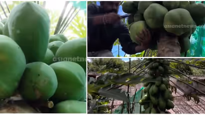 ഇടുക്കി: പപ്പായയുടെ ഒരു ഞെട്ടിൽ എത്ര കായകളുണ്ടാകും? സാധാരണഗതിയിൽ പപ്പായയുടെ ഒരു ഞെട്ടിൽ ഒരു കായയാണ് ഉണ്ടാകാറുള്ളത്. എന്നാൽ ഈ പതിവ് തെറ്റിച്ചുകൊണ്ട് ഇടുക്കി ഡൈമുക്കിലുള്ള സിനിമാ നടനും ഫോട്ടോഗ്രാഫറുമായ രമേഷ് കുമാറിന്റെ വീട്ടുമുറ്റത്ത് നിൽക്കുന്ന പപ്പായ മരം കൗതുകക്കാഴ്ചയാവുകയാണ്. ഒരു ഞെട്ടിൽ ആറ് പപ്പായകൾ വരെയാണ് കൂട്ടമായി തൂങ്ങിക്കിടക്കുന്നത്. ചില ഞെട്ടുകളിൽ അഞ്ചും നാലുമെല്ലാം കായകൾ കാണാം.