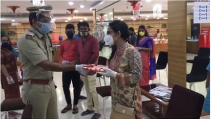 തൃശ്ശൂർ: കൊവിഡ് പ്രോട്ടോക്കോൾ പാലിച്ചതിന് തൃശൂർ സിറ്റി പൊലീസിന്റെ ഓണക്കോടി. നഗരത്തിലെ തിരക്കേറിയ ഒരു വസ്ത്രവ്യാപാര സ്ഥാപനത്തിൽ തുണിത്തരങ്ങൾ തിരഞ്ഞെടുത്തശേഷം ബിൽ അടയ്ക്കാൻ കാത്തിരിക്കുകയായിരുന്നു ചെന്ത്രാപ്പിന്നി ചാമക്കാല സ്വദേശിയായ അരുൺ വിശ്വനാഥും ഭാര്യ പ്രെറ്റി രാധാകൃഷ്ണനും. പെട്ടെന്ന് രണ്ട് പോലീസുകാർ അവരുടെ അടുത്തേക്കെത്തി.
