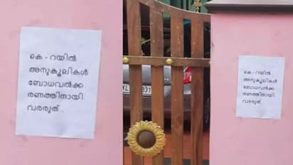 ആലപ്പുഴ: കെ റെയിൽ (K Rail) ബോധവൽക്കരണത്തിന് ആരും വരരുതെന്ന പോസ്റ്റർ ഗേറ്റിന് പുറത്ത് മതിലിൽ പതിപ്പിച്ച് കുടുംബങ്ങൾ. ബോധവൽക്കരണത്തിനായി എത്തിയ സിപിഎം (CPM) നേതാക്കളെ തിരിച്ചയച്ചതിന് പിന്നാലെയാണ് ചെങ്ങന്നൂർ (Chengannur) പുന്തല പ്രദേശത്തുകാർ ഗേറ്റിന് പുറത്ത് പോസ്റ്റർ പതിച്ചത്. പത്തോളം കുടുംബങ്ങളാണ് ഇങ്ങനെ പോസ്റ്റർ പതിച്ചത്. കെ - റെയിൽ അനുകൂലികൾ ബോധവൽക്കരണത്തിനായി വരരുത് - എന്നെഴുതിയ പോസ്റ്ററാണ് പതിച്ചിരിക്കുന്നത്.