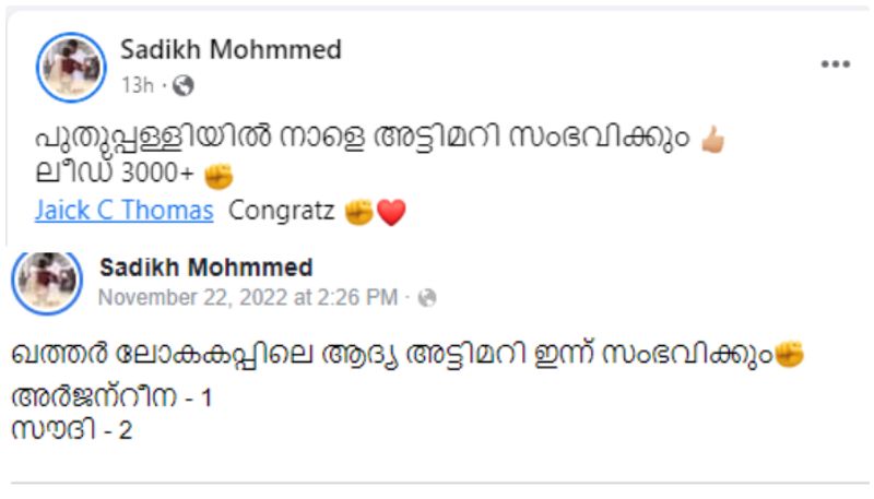 സാദിഖ് കഴിഞ്ഞ വര്ഷം നടത്തിയ ഒരു പ്രവചനം കേരളമാകെ ചര്ച്ച ചെയ്യപ്പെട്ടതാണ്. ഖത്തറില് കഴിഞ്ഞ വര്ഷം നടന്ന ലോകകപ്പില് അര്ജന്റീന സൗദിയോട് തോല്ക്കുമെന്നാണ് സാദിഖ് പ്രവചിച്ചത്. ലോകകപ്പില് ഫേവറിറ്റുകളായി വന്ന അര്ജന്റീന സൗദിയോട് തോറ്റത് ലോകം ഞെട്ടലോടെയാണ് കണ്ടു നിന്നത്. സ്കോര് നില ഉള്പ്പെടെ സാദിഖിന്റെ പ്രവചനം ശരിയാവുകയും ചെയ്തു. സാദിഖിന്റെ ഈ രണ്ടു പ്രവചനങ്ങളുടെയും സ്ക്രീൻ ഷോട്ടുകളാണ് ഇപ്പോള് വൈറല് ആയിട്ടുള്ളത്.