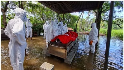 കായംകുളം: മഴ മൂലം വെള്ളത്താല് ചുറ്റപ്പെട്ട വീട്ടുവളപ്പില് കൊവിഡ് ബാധിച്ച് മരിച്ചയാളുടെ മൃതദേഹം മാനദണ്ഡങ്ങള് പാലിച്ച് ഡിവൈഎഫ്ഐ സന്നദ്ധ സേനയുടെ നേതൃത്വത്തില് സംസ്കരിച്ചു. സിപിഎം പ്രവര്ത്തകയായ പത്തിയൂര് കൃഷ്ണാ നിവാസില് ആര് കെ വനജ (50) യാണ് കൊവിഡ് ബാധിച്ച് മരിച്ചത്. പത്തിയൂര് പുഞ്ചയോരത്താണ് വീട്. ശക്തമായ മഴയില് നാലുപാടും വെള്ളത്താല് ചുറ്റപ്പെട്ട് കിടക്കുകയാണ്. മൃതദേഹം വള്ളത്തിലാണ് വീട്ടില് എത്തിച്ചത്. വെള്ളം കയറിയ ഭാഗത്ത് പ്രത്യേക സംവിധാനമൊരുക്കിയാണ് ചിതയൊരുക്കിയത്.