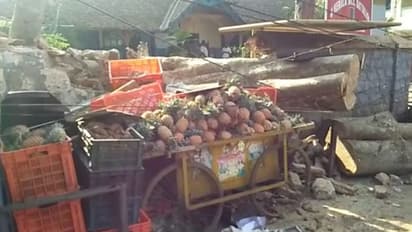 തിങ്കളാഴ്ച വൈകുന്നേരം 3.35 ഓടെയാണ് റോഡിലേക്ക് മരം കടപുഴകി വീണത്. സ്കൂൾ മതിലിനോട് ചേർന്ന് റോഡിൽ തങ്കമണി എന്ന വിധവ പഴവർഗ്ഗങ്ങൾ വിൽക്കുന്ന ഉന്തു വണ്ടിക്കും മുകളിലേക്കാണ് മതിൽ തകർത്ത് മരം വീണത്. ശബ്ദം കേട്ട് തങ്കമണി ഓടി മാറിയതിനാൽ മരത്തിനടിയിൽപ്പെടാതെ രക്ഷപ്പെടുകയായിരുന്നു. ഇവരുടെ കട പൂർണ്ണമായും തകർന്നു.