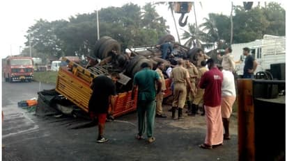 ദേീശയപാതയിൽ ചന്തിരൂർ പുതിയ പാലത്തിൽ വച്ച് ചൊവ്വാഴ്ച പുലർച്ചെ 6 മണിയോടെയായിരുന്നു അപകടം. പെട്ടെന്ന് ബ്രേക്ക് ചെയ്തപ്പോൾ നിയന്ത്രണംതെറ്റി മീഡീയനിലേക്ക് മറിയുകയായിരുന്നു. കൊട്ടിയത്തു നിന്ന് ഒഴിഞ്ഞ കോള കുപ്പിയുമായി എറണാകുളത്തേക്ക് പോകുകയായിരുന്നു ലോറി. റോഡിൽ കോള കുപ്പികൾ ചിന്നി ചിതറി കിടന്നതിനാൽ കുറച്ചനേരം ദേശീയ പാതയിൽ ഗതാഗതം സ്തംഭിച്ചു. അരൂർ പോലീസ് സ്ഥലത്തെത്തി ഗതാഗതം ഒറ്റവരിയാക്കി തുടർന്നു.