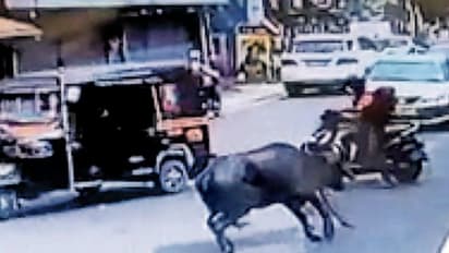 റോഡിലിറങ്ങിയ പോത്ത് ഇരുചക്രവാഹനം മറിച്ചു. യാത്രക്കാരന് ഓടി രക്ഷപ്പെട്ടു. ഏറെ നേരെയാണ് നഗരത്തില് പോത്ത് ആശങ്ക സൃഷ്ടിച്ചത്. നാട്ടുകാര് തളയ്ക്കാന് ശ്രമിച്ചെങ്കിലും നടന്നില്ല. ആരുടേതാണ് പോത്തെന്നും എവിടെനിന്നാണ് വന്നതെന്നും വ്യക്തമല്ല. മാഞ്ഞാലി ഭാഗത്തുനിന്നാണ് പോത്ത് കെട്ടുപൊട്ടിച്ച് വന്നതെന്ന് സൂചനയുണ്ട്. പൊലീസിനും പോത്തിനെ സംബന്ധിച്ച് വിവരമൊന്നും ലഭിച്ചിട്ടില്ല. വ്യാപാര സ്ഥാപനങ്ങള്ക്കും യാത്രക്കാര്ക്കും വാഹനങ്ങള്ക്കും ഏറെ നേരമാണ് പോത്ത് പൊല്ലാപ്പുണ്ടാക്കിയത്.