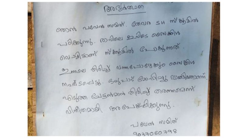 ഏറെ മോഹിച്ച് വാങ്ങിയ സൈക്കിള് മോഷണം പോയി; പ്ലസ് വൺ വിദ്യാര്ത്ഥിയുടെ അപേക്ഷ വൈറല്
