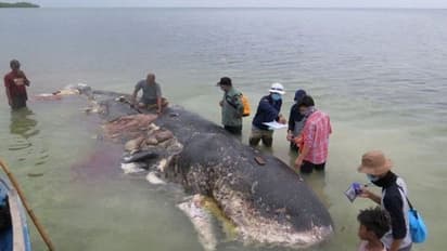 9.5 മീറ്റര് നീളമായിരുന്നു തിമിംഗലത്തിന്. അതിന്റെ വയറ്റില് നിന്ന് കണ്ടെത്തിയത് 115 പ്ലാസ്റ്റിക് കപ്പ്, നാല് പ്ലാസ്റ്റിക് കുപ്പികള്, രണ്ട് ചെരുപ്പുകള്, 25 പ്ലാസ്റ്റിക് ബാഗുകള്, 1000 പ്ലാസ്റ്റിക് വള്ളികള് എന്നിവയാണ്.