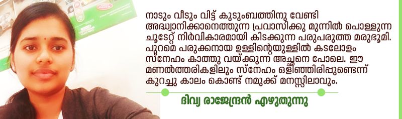 നാടും വീടും വിട്ട് കുടുംബത്തിനു വേണ്ടി അദ്ധ്വാനിക്കാനെത്തുന്ന പ്രവാസിക്കു മുന്നില് പൊള്ളുന്ന ചൂടേറ്റ് നിര്വികാരമായി കിടക്കുന്ന പരുപരുത്ത മരുഭൂമി. പുറമെ പരുക്കനായ ഉള്ളിന്റെയുള്ളില് കടലോളം സ്നേഹം കാത്തു വയ്ക്കുന്ന അച്ഛനെ പോലെ. ഈ മണല്ത്തരികളിലും സ്നേഹം ഒളിഞ്ഞിരിപ്പുണ്ടെന്ന് കുറച്ചു കാലം കൊണ്ട് നമുക്ക് മനസ്സിലാവും.