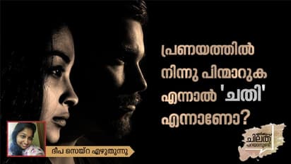 പ്രണയത്തിൽ നിന്നു പിന്മാറുക എന്നതിനെ ചതി എന്ന ഒറ്റപ്പേരിട്ടു വിളിക്കുകയാണ് സമൂഹം. ചതികളും ചതിക്കുഴികളും ഇല്ലെന്നല്ല. പക്ഷെ അന്വേഷിക്കണം, അറിയണം... എന്ത് കൊണ്ട് അവൻ അകന്നു, അവൾ അകന്നു! പ്രണയം... അത് മനോഹരമാണ്.. പ്രണയത്തിലേക്ക് വീഴുക എന്നാണ് പ്രയോഗം തന്നെ... അതെ കണ്ണുമടച്ചു വീഴുകയാണ് അതിലേക്ക്..
