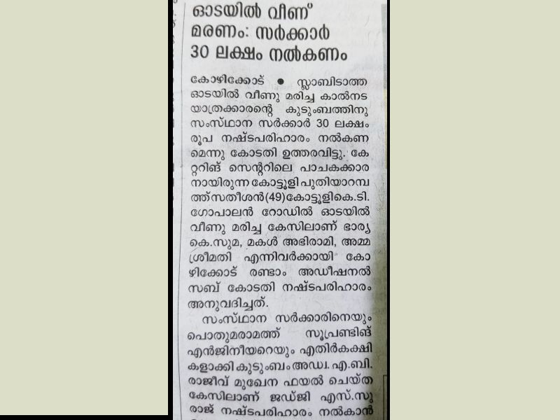 വൈറ്റില, കുണ്ടന്നൂര് മേല്പ്പാലങ്ങള് ആഘോഷമായി തുറന്നതിന്റെ ചിത്രവുമായിറങ്ങിയ പത്രങ്ങളുടെ ഉള്പ്പേജില് അധികമാരും ശ്രദ്ധിക്കാനിടയില്ലാത്ത മറ്റൊരു മൂന്നുവരി വാര്ത്തയുണ്ടായിരുന്നു. കോഴിക്കോട് കോട്ടൂളി പുതിയാമ്പറമ്പത്ത് സതീശന്റെ ഭാര്യ സുമയ്ക്ക് കേരള സര്ക്കാര് 30 ലക്ഷം രൂപ നഷ്ടപരിഹാരം നല്കണമെന്ന് കോടതി വിധിച്ച വാര്ത്തയായിരുന്നു അത്. സാധു കുടുംബത്തിന്റെ ഏക അത്താണിയായ സതീശന് എന്ന പാചകത്തൊഴിലാളി ജോലി കഴിഞ്ഞു വീട്ടിലേക്ക് എത്താന് ഓടുന്നതിനിടെ ഓടയില് വീണു മരിയ്ക്കുകയായിരുന്നു!