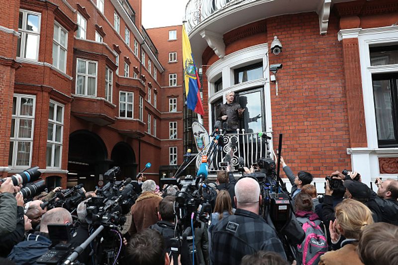 (ബ്രിട്ടനിലെ ഇക്വഡോര് എംബസില് അഭയം തേടിയ കാലത്ത് ജൂലിയന് അസാഞ്ച് മാധ്യമ പ്രവര്ത്തകരോട് സംസാരിക്കുന്നു)