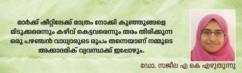 മാര്ക്ക് ഷീറ്റിലേക്ക് മാത്രം നോക്കി കുഞ്ഞുങ്ങളെ മിടുക്കരെന്നും കഴിവ് കെട്ടവരെന്നും തരം തിരിക്കുന്ന ഒരു പഴഞ്ചന് വാധ്യാരുടെ രൂപം തന്നെയാണ് നമ്മുടെ അക്കാദമിക് വ്യവസ്ഥക്ക് ഇപ്പോഴും. പരീക്ഷയില് എഴുതി ഫലിപ്പിക്കാന് കഴിയാത്തത് കൊണ്ടു മാത്രം അനേകം കുഞ്ഞു സ്വപ്നങ്ങളും പ്രതീക്ഷകളും ഓരോ വര്ഷവും ക്ലാസ് റൂമുകളില് പൊലിഞ്ഞു പോകുന്നു. ഈ കുട്ടിക്കണ്ണീരും വേദനയും ഇന്ന് മുഖ്യധാരയില് വരുന്നില്ല എങ്കിലും പല തരത്തിലുള്ള പെരുമാറ്റ വൈകല്യങ്ങളായും മാനസിക പ്രശ്നങ്ങളായും അവ ഭാവിയിലെ സാമൂഹിക ആരോഗ്യത്തെ തന്നെ പ്രതികൂലമായി ബാധിച്ചേക്കാം.നാളത്തെ ഉത്തമ പൗരന്മാര് മാത്രമല്ല അധോലോകനായകന്മാരും സാമൂഹ്യദ്രോഹികളും ഒക്കെ ഇന്നത്തെ വിദ്യാലയങ്ങളില് തന്നെയുണ്ടെന്ന സത്യം വിസ്മരിക്കാവതല്ല.