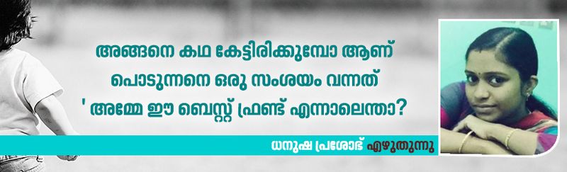 അങ്ങനെ കഥ കേട്ടിരിക്കുമ്പോ ആണ് പൊടുന്നനെ ഒരു സംശയം വന്നത് ' അമ്മേ ഈ ബെസ്റ്റ് ഫ്രന്റ് എന്നാലെന്താ? മൂന്ന് വയസ്സുള്ള അവന്റെ ആ സംശയം അവനു മനസ്സിലാവുന്ന പോലെ അന്ന് എന്തൊക്കെയോ ഞാനും പറഞ്ഞു കൊടുത്തു.