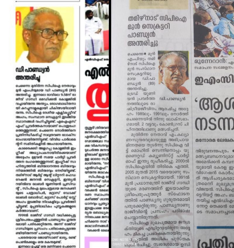 ഡി പാണ്ഡ്യന്റെ മരണവാര്ത്ത ജനയുഗം, മലയാള മനോരമ പത്രങ്ങളില്