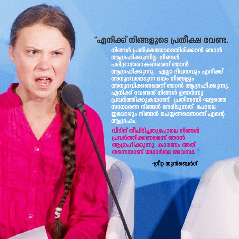 ''എനിക്ക് നിങ്ങളുടെ പ്രതീക്ഷ വേണ്ട. നിങ്ങള് പ്രതീക്ഷയോടെയിരിക്കാന് ഞാന് ആഗ്രഹിക്കുന്നില്ല. നിങ്ങള് പരിഭ്രാന്തരാകണമെന്ന് ഞാന് ആഗ്രഹിക്കുന്നു. എല്ലാ ദിവസവും എനിക്ക് അനുഭവപ്പെടുന്ന ഭയം നിങ്ങളും അനുഭവിക്കണമെന്ന് ഞാന് ആഗ്രഹിക്കുന്നു. എനിക്ക് വേണ്ടത് നിങ്ങള് ഉണര്ന്നു പ്രവര്ത്തിക്കുകയാണ്. പ്രതിസന്ധി ഘട്ടത്തെ സാധാരണ നിങ്ങള് നേരിടുന്നത് പോലെ ഇപ്പോഴും നിങ്ങള് ചെയ്യണമെന്നാണ് എന്റെ ആഗ്രഹം. വീടിന് തീപിടിച്ചതുപോലെ നിങ്ങള് പ്രവര്ത്തിക്കണമെന്ന് ഞാന് ആഗ്രഹിക്കുന്നു, കാരണം അത് തന്നെയാണ് യഥാര്ത്ഥ അവസ്ഥ.''